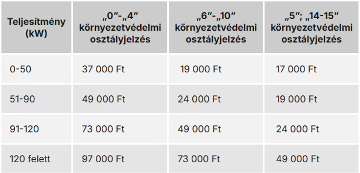 Például a 2025-től érvényes táblázatok szerint egy 0–50 kW teljesítményű autó esetében a környezetvédelmi osztálytól függően az adó havonta 17 000 Ft-tól akár 37 000 Ft-ig terjedhet.